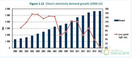 IEA提供的相关图表显示,2015年,中国电力需求同比增长放缓;而5年前,中国电力需求同比增长超过12%。